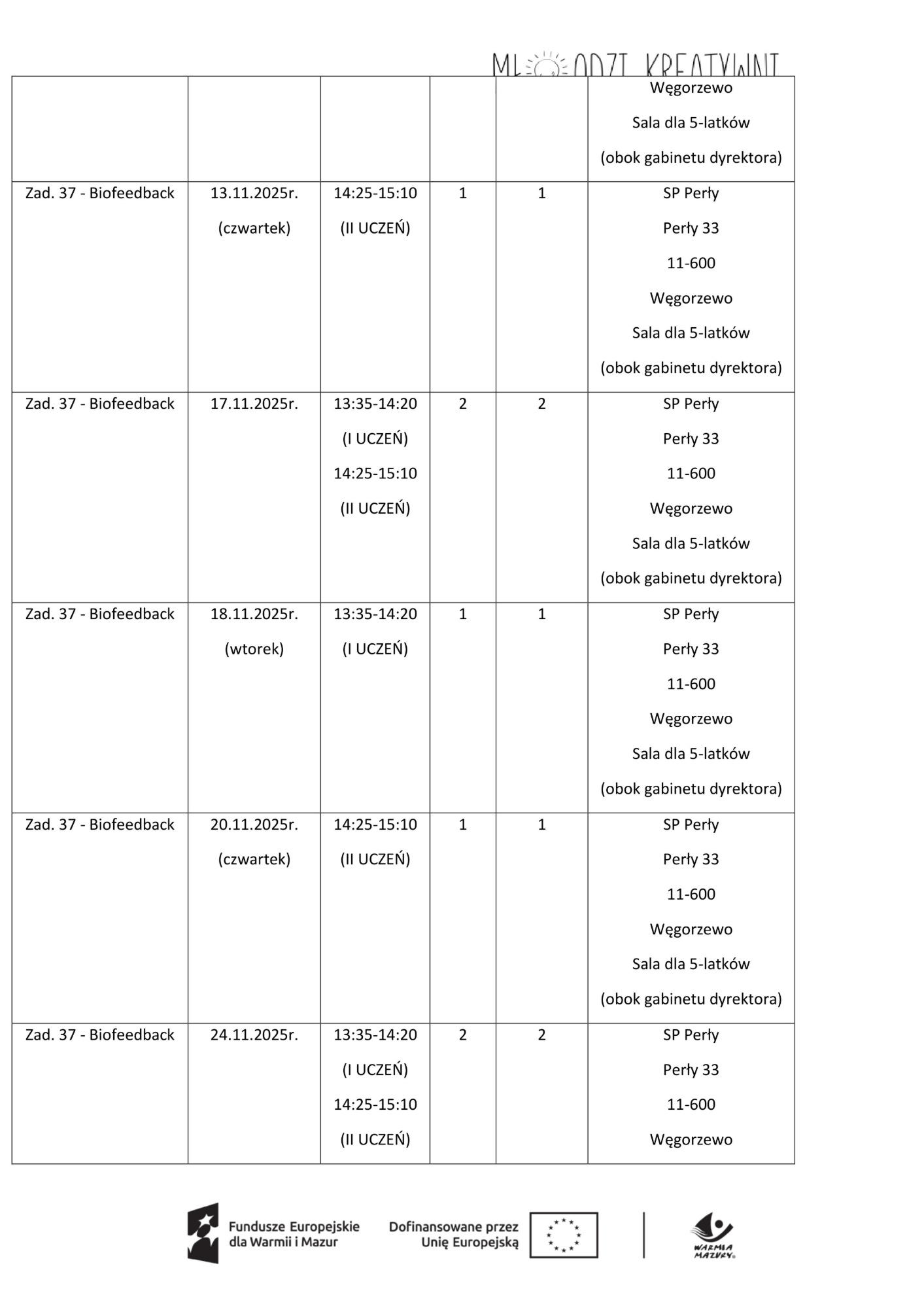 Trening Biofeedback - zajęcia indywidualne, trening biofeedback prowadzony za pomocą programu VERIM oraz technologii VR. Zajęcia mają na celu pomóc uczniom rozwinąć umiejętność zarządzania emocjami oraz radzenia sobie ze stresem. Zajęcia są dostosowane do możliwości i potrzeb uczniów. Pomagają zauważyć reakcje stresu, relaksu oraz koncentracji. Uczą jak w nich pozostawać np. w stanie koncentracji lub wychodzić np. z reakcji stresu.